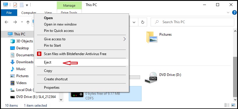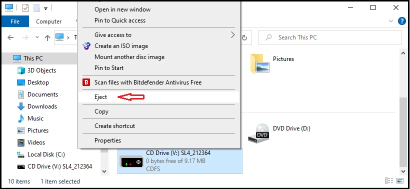 To unmount the disc image when you’re done, right-click the virtual disc drive and select Eject.